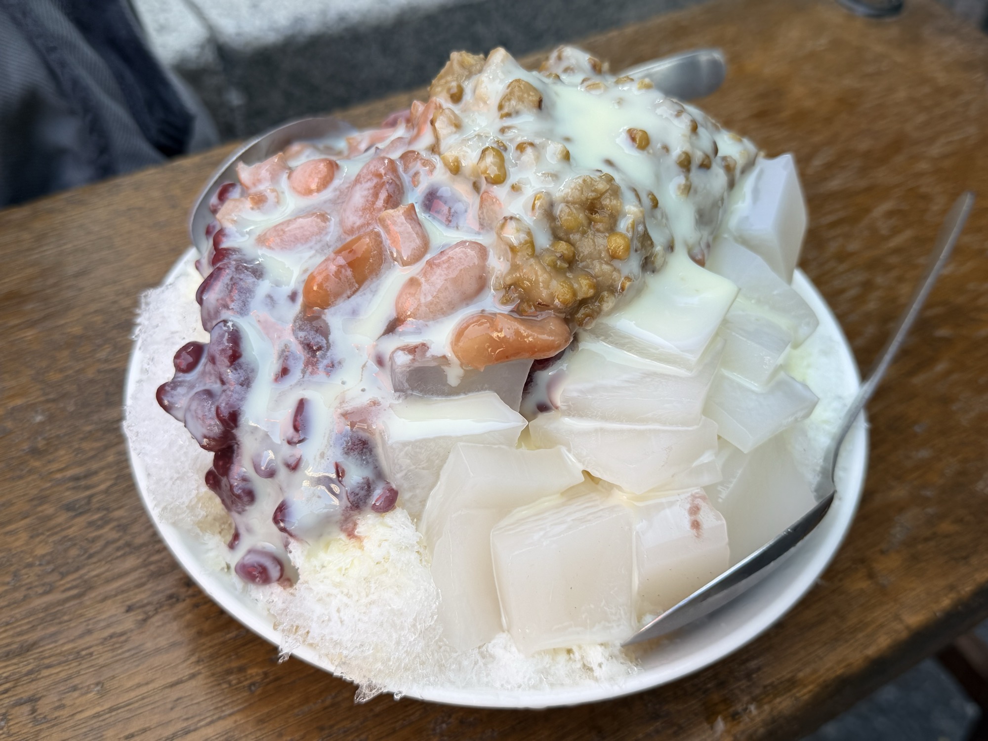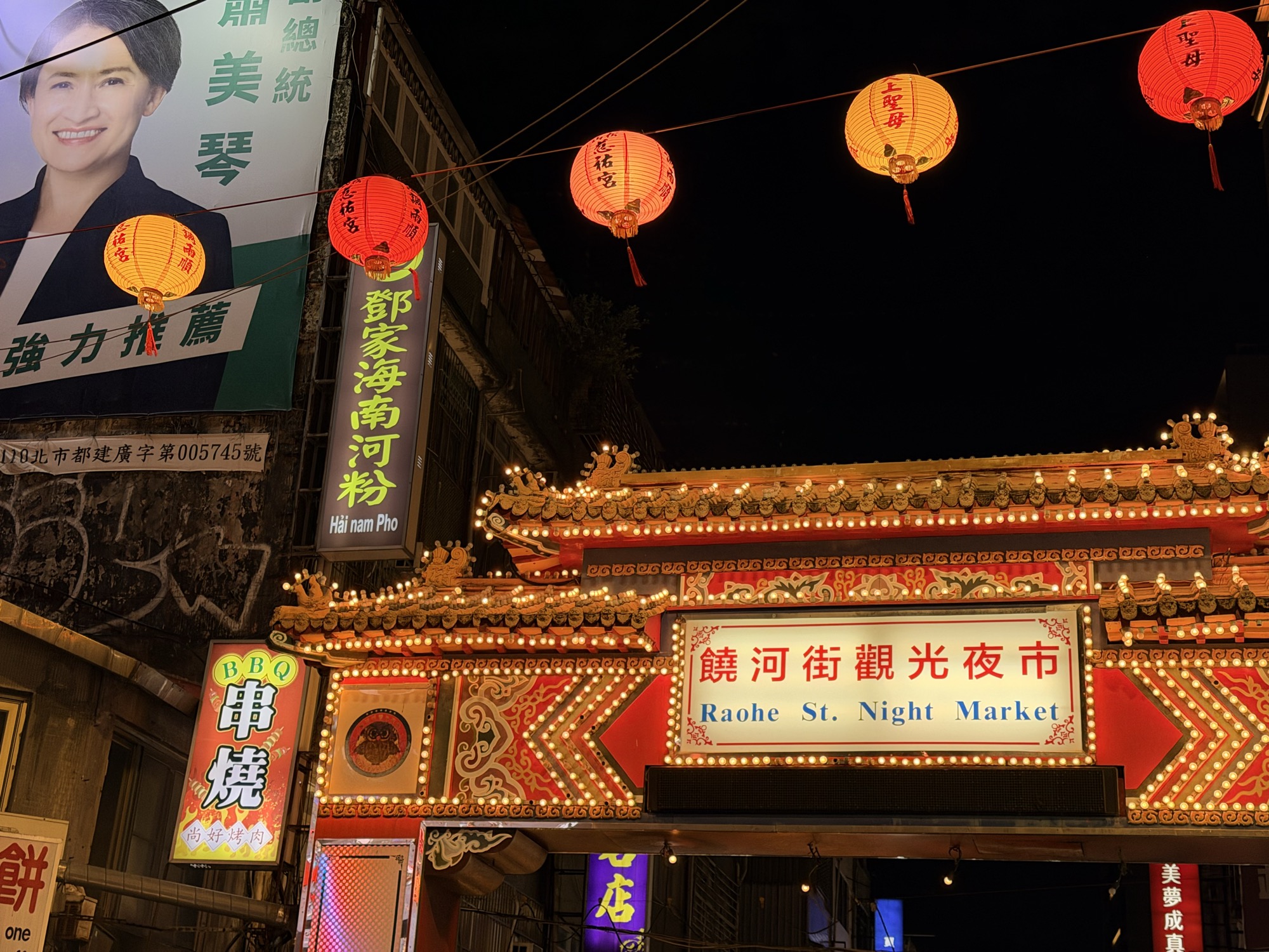 饶河夜市本来没打算去,结果吃到了全程最惊艳的几样。门口的米其林胡椒饼一口入魂,这东西带不走只能现场吃,我会想念的。马告香肠也是新体验——马告是台湾原住民对山胡椒的叫法,吃起来有股柠檬香气。冰火汤圆把热腾腾的汤圆放在刨冰上,端上来像放了干冰,最后浇桂花蜜和柠檬汁,酸甜爽口。出门时又花五十块台币买了葱抓饼加九层塔和蛋——吃撑了都还能再吃一个。