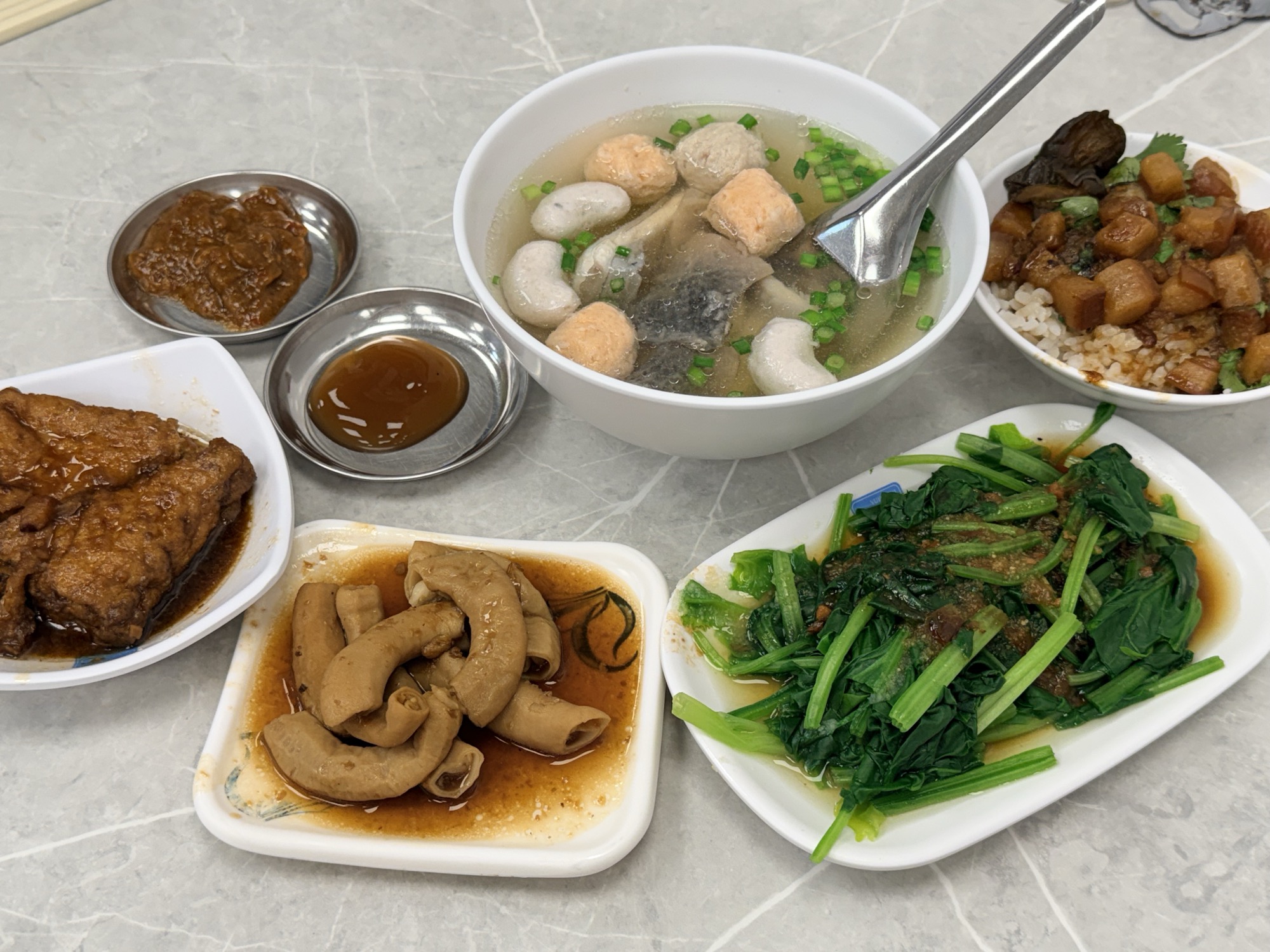 面线是最大的惊喜。之前觉得面线能有什么好喝的,直到在面线传奇喝了第一口。卤肥肠软烂浓香没有脏味,蚵仔鲜甜不腥,配着黏糊糊的面线加蒜泥、辣酱、乌醋、白胡椒——久违的好味道。临走前又去吃了一碗,一样好吃。