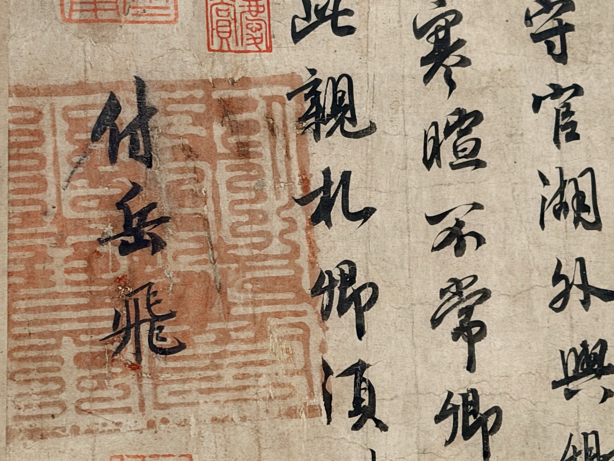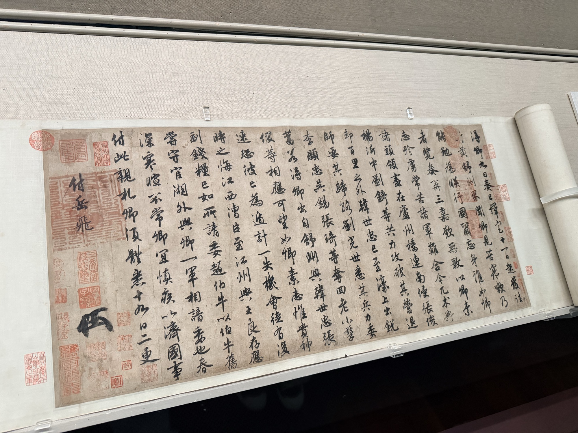 最让我动容的是一件书法。赵构,宋高宗,亲笔所书的赐岳飞批劄。赵构本身是顶级书法家,这幅字里能看到他研习兰亭序之后的笔法影响。但让人心绪难平的是背后的故事——文中对岳飞鼓励嘉勉,写下这篇批文八个月后,他就杀了岳飞。岳飞、金兀术、韩世忠、张浚,一个个名字就在眼前。站在那里,离这件近千年前的东西这么近,呼吸都急促起来,眼眶也有点热。